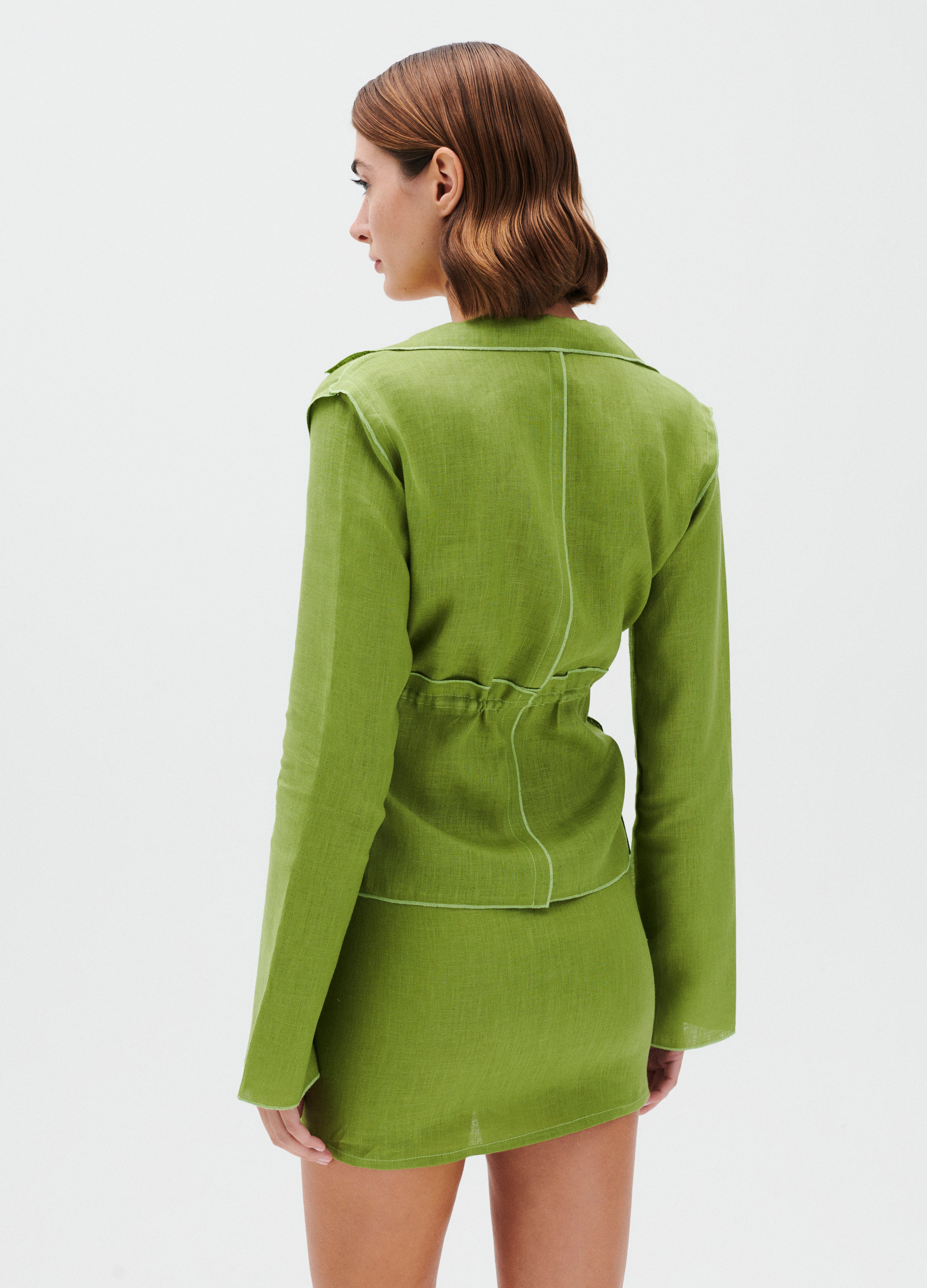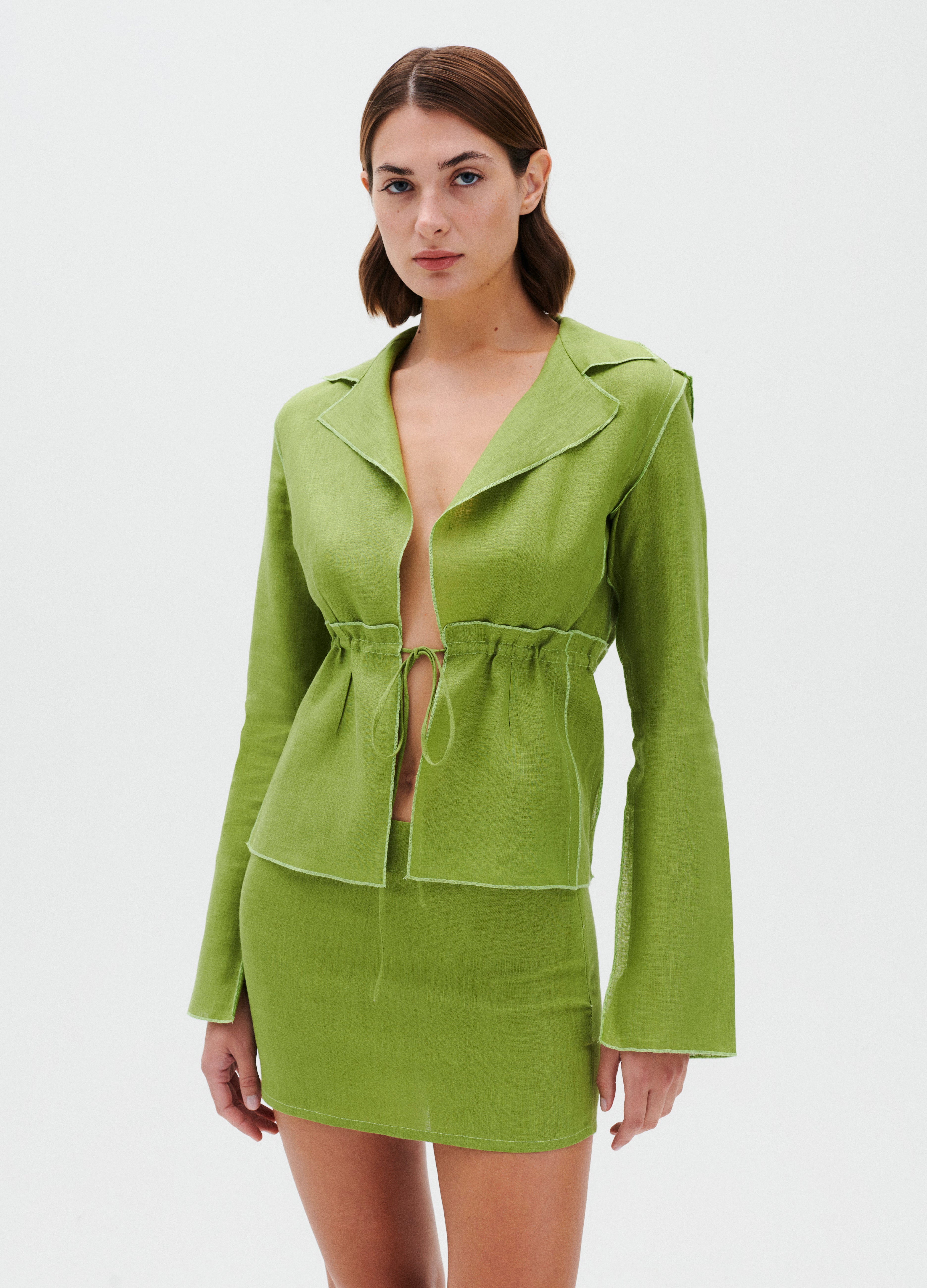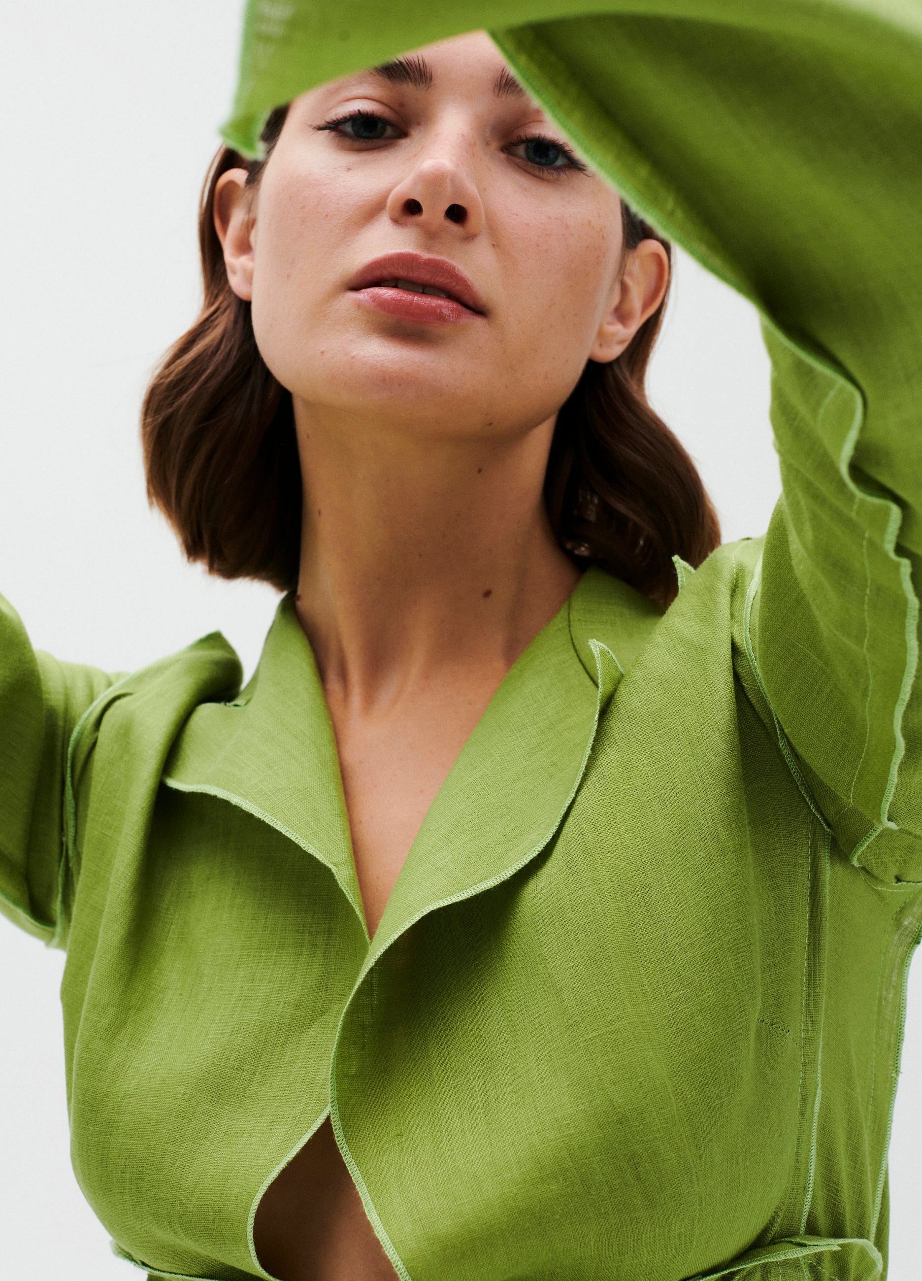 Questo completo in lino verde è un perfetto esempio di eleganza minimalista e fresca, ideale per le giornate estive. La camicia presenta un taglio morbido e rilassato, con una chiusura regolabile a coulisse in vita che permette di adattarla alla silhouette, creando una figura femminile e definita. Il colletto ampio e le