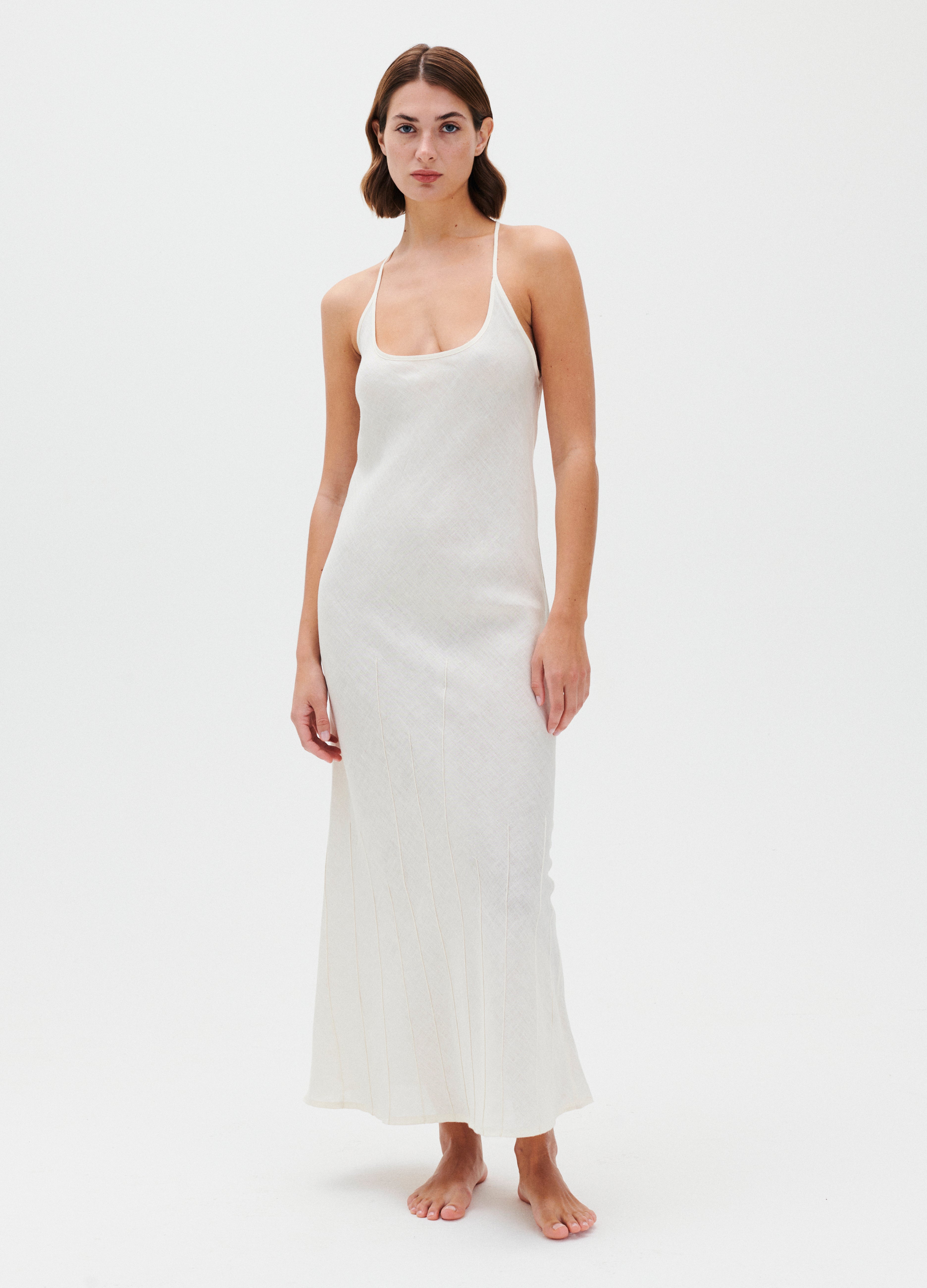 This long white dress is a perfect example of minimalist elegance, featuring a silhouette