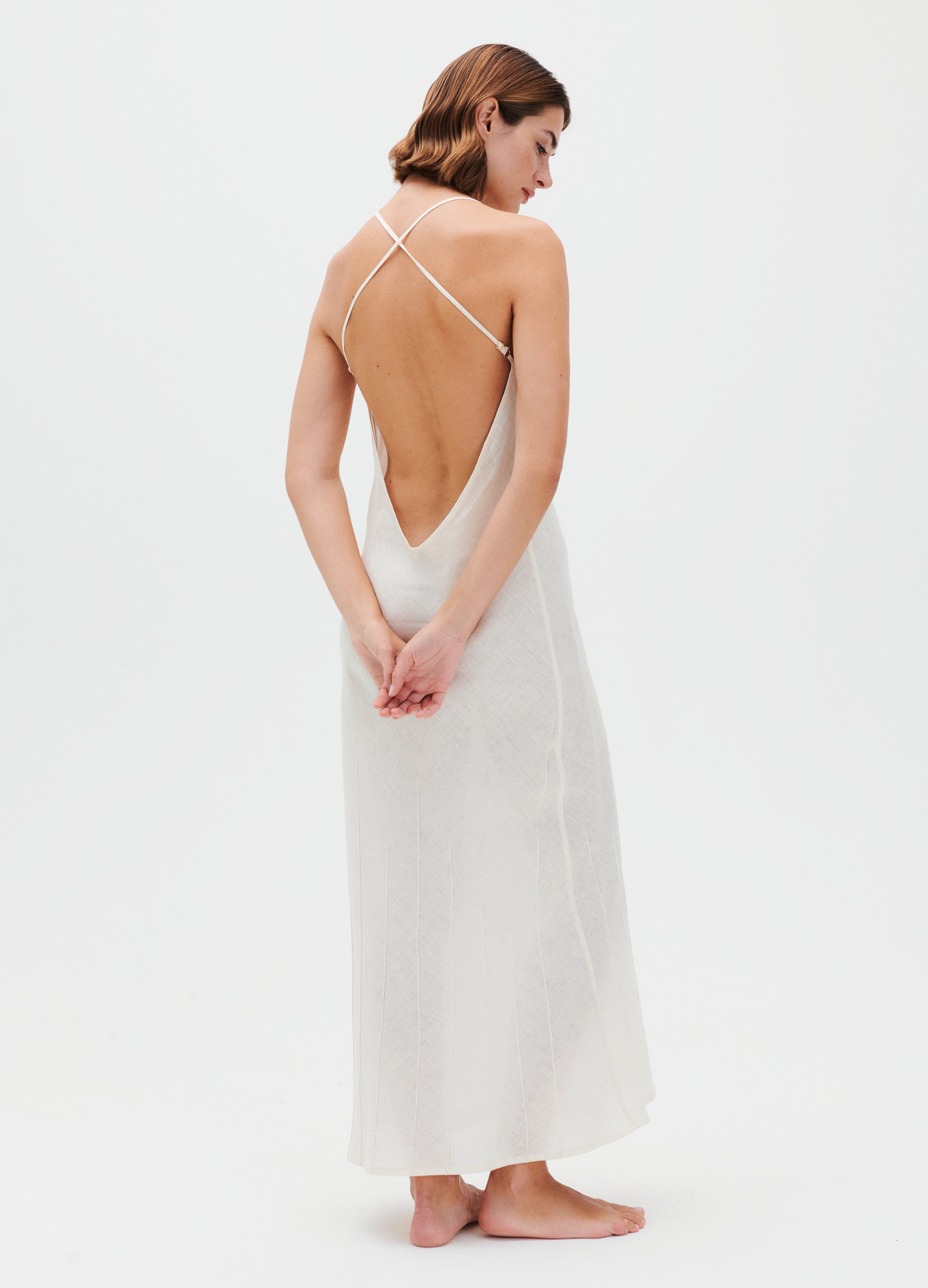 flowing and a deep neckline on the back. The thin crossed straps create a sensual and refined effect, delicately revealing the back in an elegant and feminine way. The soft cut of the dress makes it perfect for summer days, offering comfort and freshness thanks to the